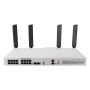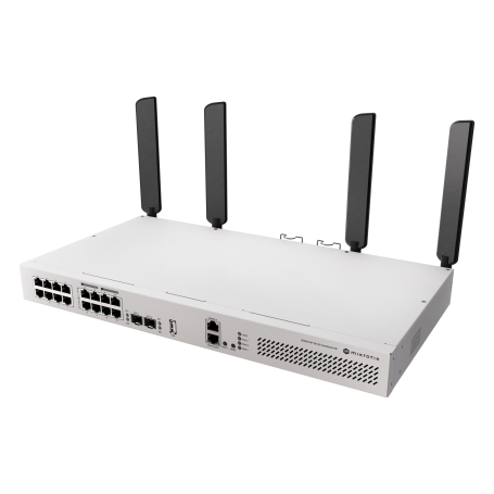 The Wi-Fi version of CRS418 with Mikrotik's strongest 4x4 MIMO Wi-Fi 6, L3 HW offloading, quad-core 2.2 GHz ARM CPU, 16x Gigabit Ethernet ports + a Gigabit management port with a direct CPU line, 2x 10G SFP+ ports, PoE-out.