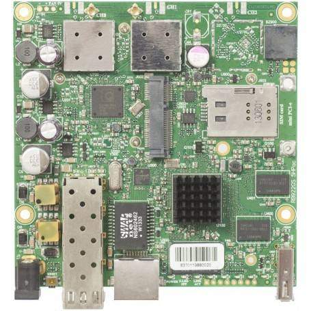 720Mhz CPU, 128MB RAM, 1xGigabit Ethernet, 1xSFP cage, 1xminiPCI-e, 1xSIM, onboard 802.11ac Two Chain 5Ghz wireless, RouterOS L4